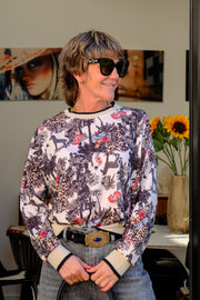 Top col élastiqué, avec liseret contrasté, à motifs animaliers inspiration safari avec des touches florales colorées et d'un motif léopard.