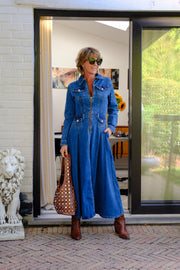 Robe en jeans boutons dorés aux poches évasée dans le bas