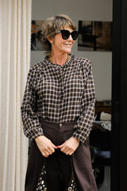 Chemise à carreaux bruns en matière pilou et fines collerette au col