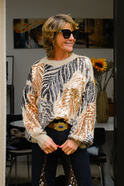 Pull col ouvert touts doux et motifs sequins feuilles. Manches bouffantes