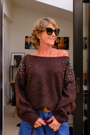 Pull col bateau ample tout doux et strass cousus colorés aux épaules