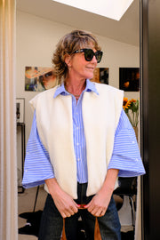Veste style laine sans manche, doublée, poches,  avec jolie coupe courte à la taille.