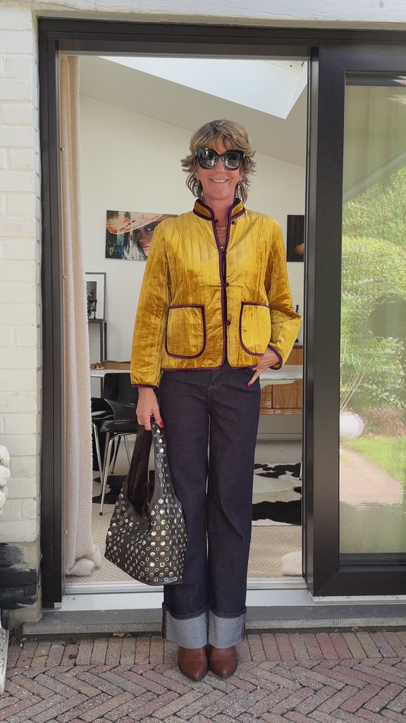 Veste matelassée gold et liseré mauve  Babeth mesure 1m72 et fait un 36 de taille. Elle porte un S/M Composition : 98% polyester, 2% élasthanne
