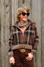 Gilet-veste aux teintes marron, doté d'une fermeture éclair, d'un col généreux et d'un motif à carreaux distinctif. Pull veste car il est très épais