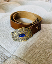 Ceinture en cuir avec boucle dorée et pierre bleu vif