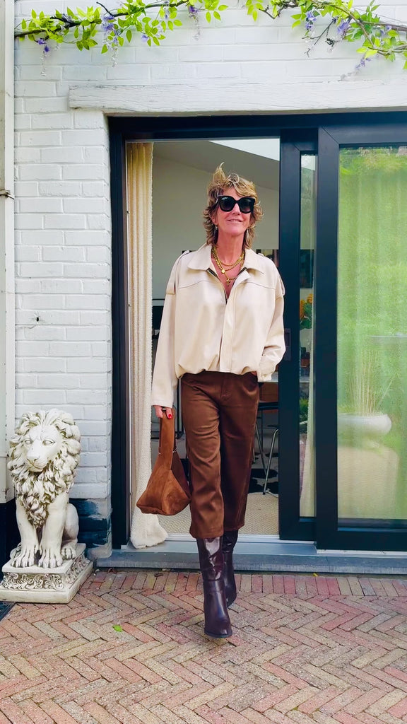 Bermuda long brun en matière suédine d'une qualité vraiment topissime ! Babeth mesure 1m72 et fait un 36 de taille. Elle porte un S .  Composition : 100 % Coton