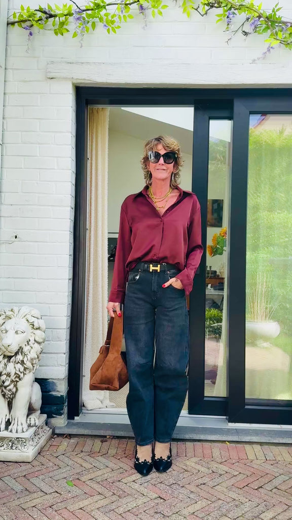 Jean gris foncé taille haute, doté d'une coupe ballon avec un peu de stretch Babeth mesure 1m72 et fait un 36 de taille. Elle porte un 36.  Composition : 66%...