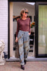 Jeans bleu clair agrémenté de bandes scintillantes ornées de strass dorés et argentés pour une touche éclatante et fun.