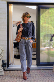 Jeans coupe ballon gris délavé bien stretch petits plis sur la taille