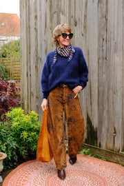 Pantalon coupe ballon en velours camel et dessins feuilles bleu