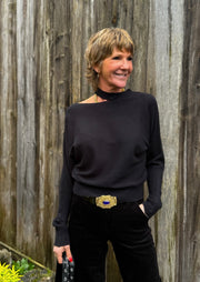 Pull à col asymétrique, coupe fluide et maille douce, manches chauve souris. Taille resserrée qui structure la silhouette