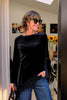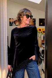 Top velours, long asymétrique, avec un col rond et finitions en dentelle dans le bas