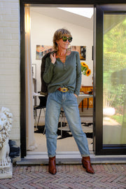 Jeans coupe ballon bleu vintage petits plis à la taille